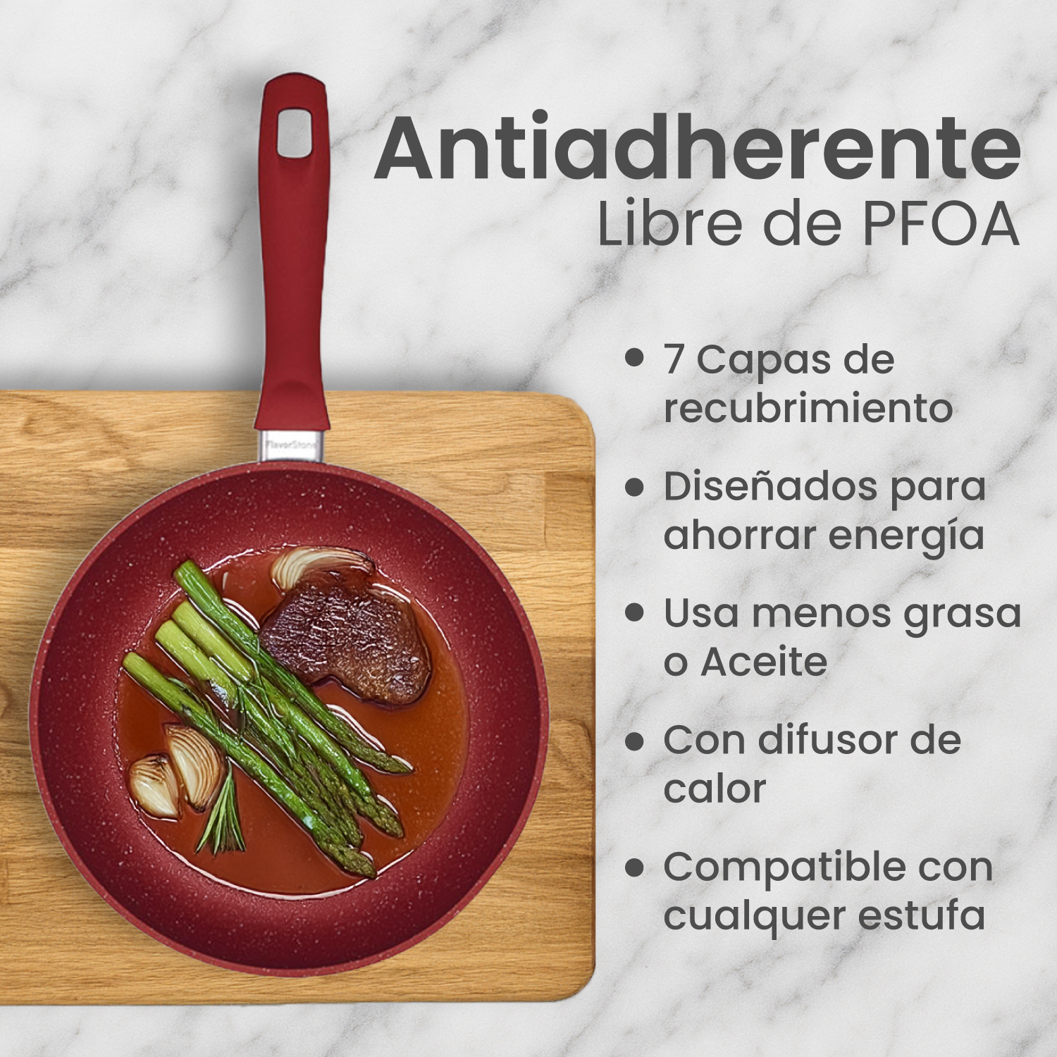 • NUEVA TECNOLOGÍA. Flavorstone se renueva con un mejor producto, ahora con mayor calibre en el cuerpo de sartén y un sistema de mango intercambiable mejorado.