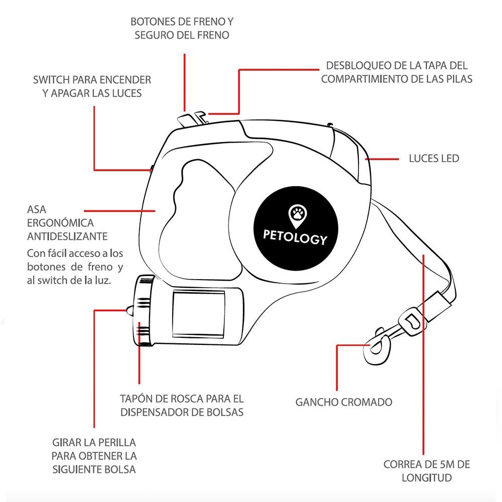 Aprovecha el dispensador de bolsas para sus desechos y la luz LED que los ayudará en todo paseo nocturno.