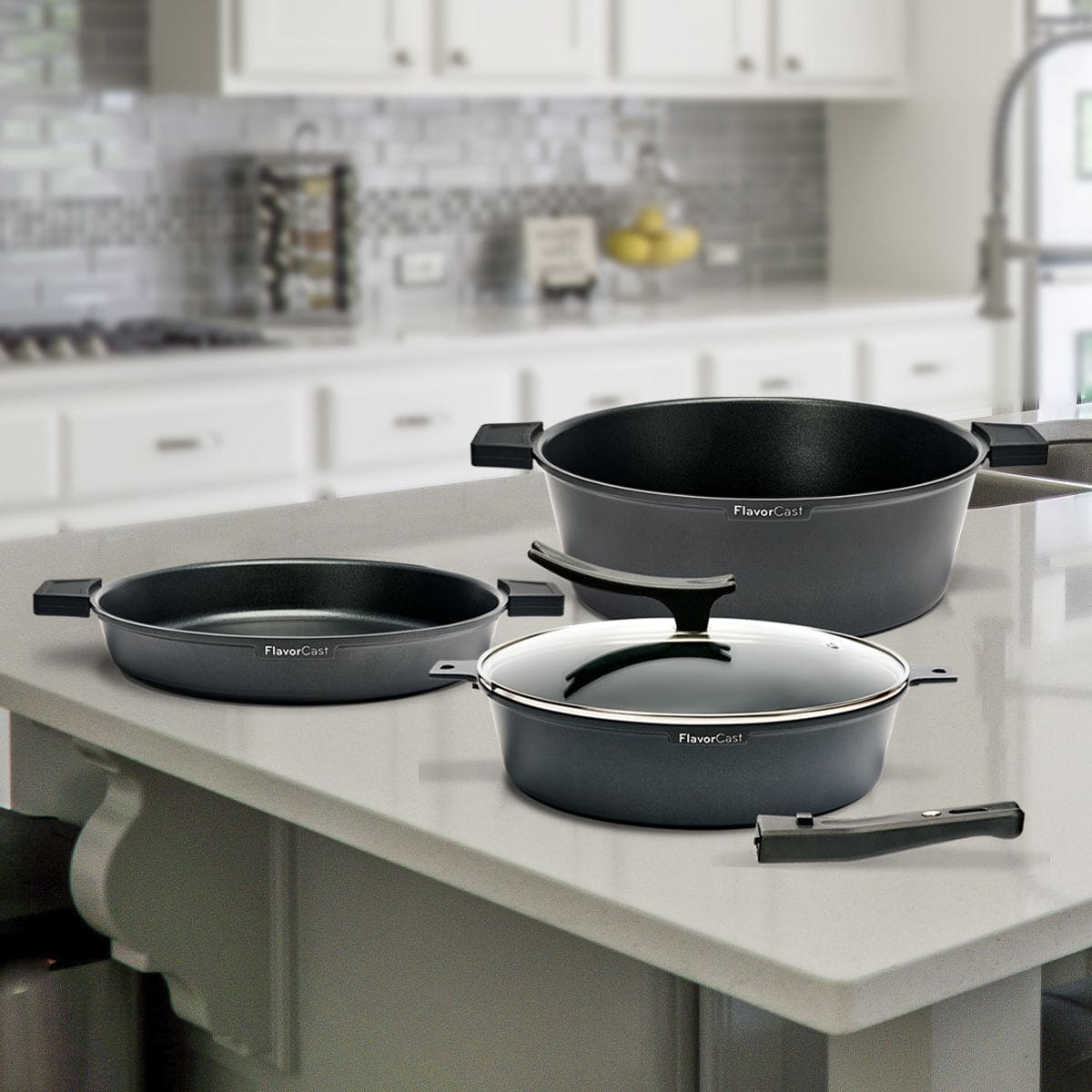 Nuestra línea de Flavorstone Cast Gran Gourmet es lo que has estado esperando para equipar tu cocina con accesorios de tamaño grande para cocinar para toda la familia: una cacerola de 28 cm, una sartén para saltear de 28 cm y una sartén profunda de 28 cm.