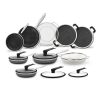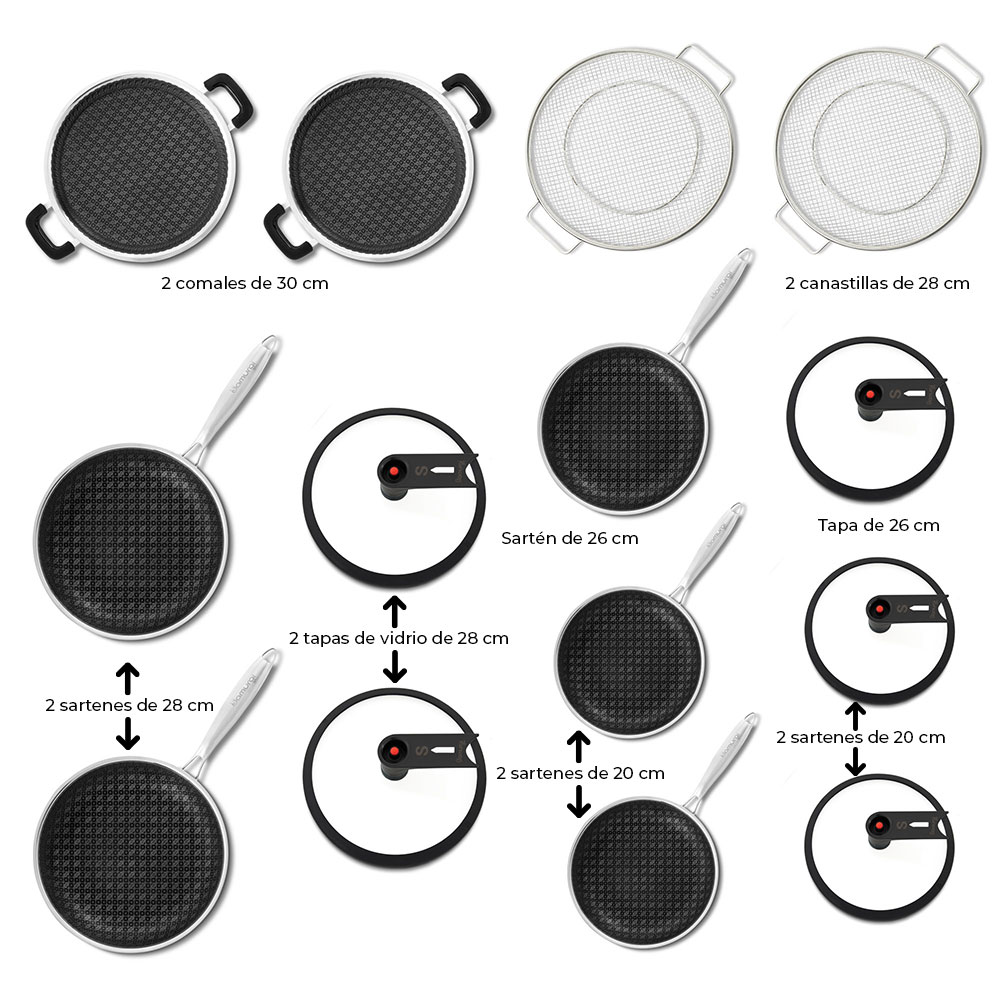 - Este Mega Set suma el set de 3 piezas y el set de 8 piezas, los cuales te darán todas las opciones que necesitas en la cocina: 4 sartenes y 4 tapas de vidrio de 20, 26 y 28 cm, 2 comales de 30 cm y una canastilla de 28 cm. ¡El equipo completo para preparar tus platillos favoritos!